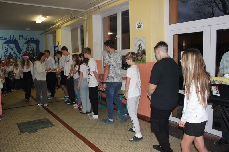 První den školy po vánočních prázdninách byl letos velmi netradiční. Na vině byla situace z pátku 22. prosince, kdy vlivem vichřice, která mimochodem poslala v noci k zemi i velký smrk u školní jídelny, nešla elektřina a pan ředitel musel narychlo vyhlásit ředitelské volno. Ne ke všem se však informace dostala včas, a proto jsme ráno byli svědky spousty slziček, hlavně u mladších dětí, protože se na odměňování reprezentantů i vánoční besídky moc těšily. A tak bylo rozhodnuto, že si ten poslední předvánoční den zopakujeme, a to takřka v původní podobě. Jedinou změnou, která nastala, byla záměna jedné z ranních vánočních koled za píseň „My tři králové jdeme k vám“. Jako celý předvánoční týden s námi i dnes „drželi basu“ zaměstnanci firmy Stauner (viz jedna z fotografií), což nás moc těší.
