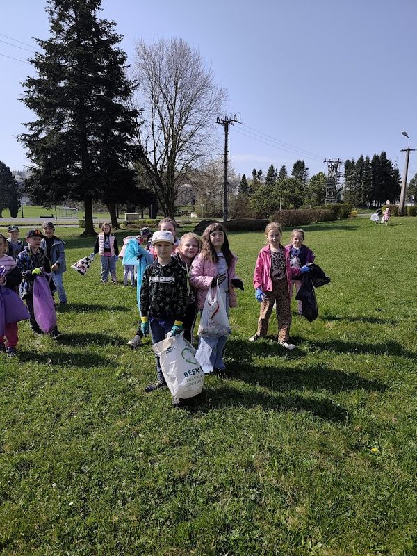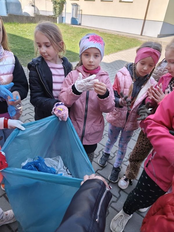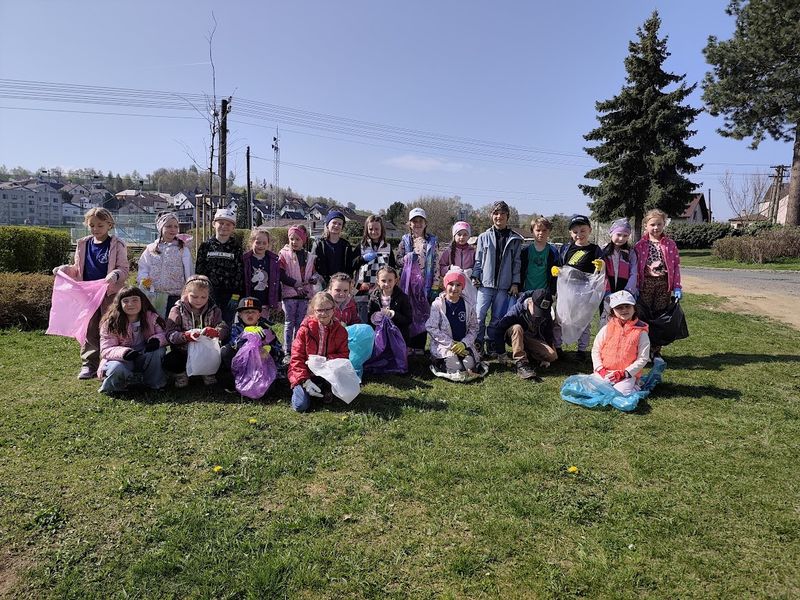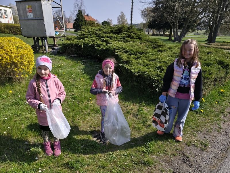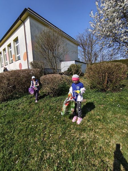 Prvňáci uklízí s velkým nadšením okolí školy.