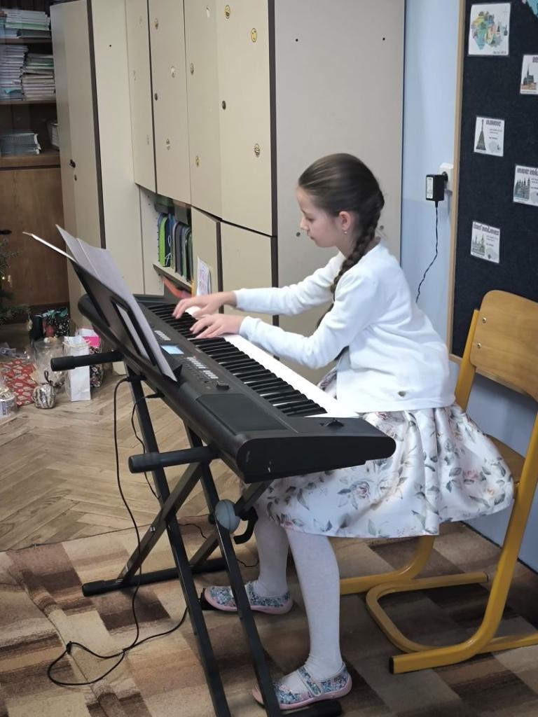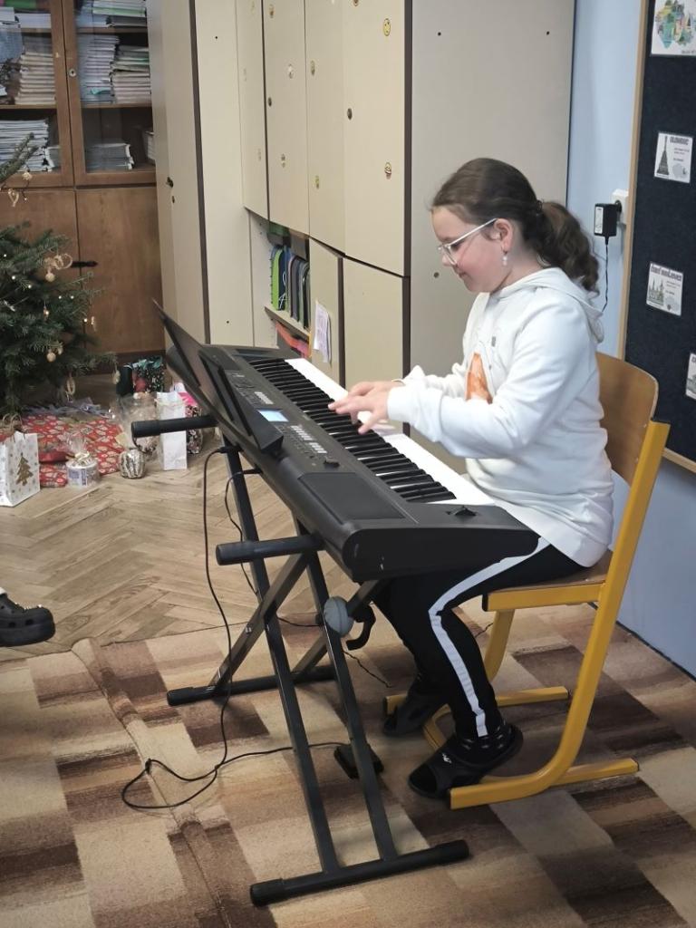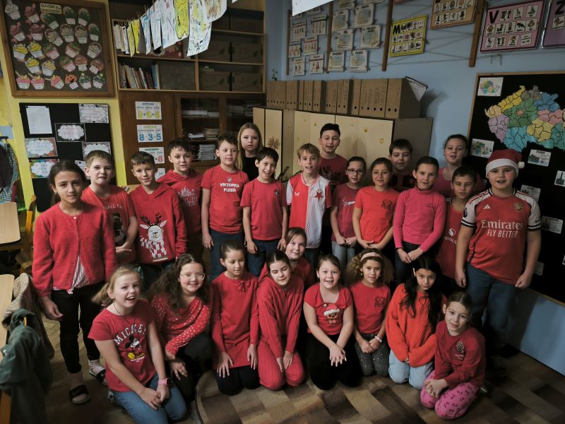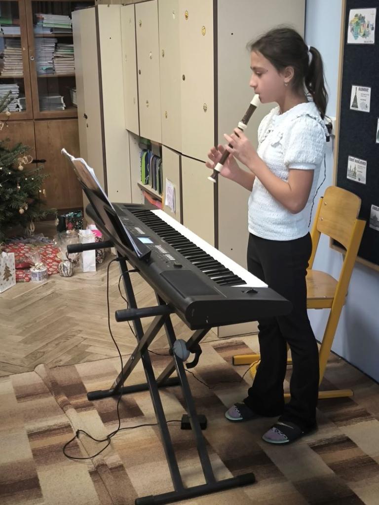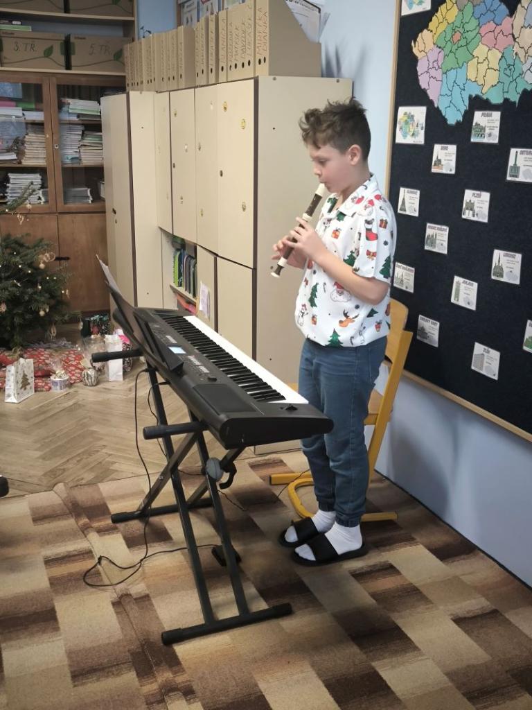 Všichni žáci chodili každý den v určených barvách. Naší třídě se povedlo, že na čtvrtek jsme si vylosovali bílou. Děvčata byla ráda, že si můžou vzít dva různé bílé vánoční outfity. Závěr týdne jsme zakončili jako vždy tradiční besídkou. Je skvělé, že nám na nástroj hraje čím dál víc spolužáků. Celá čtvrtá třída přeje všem pohodové Vánoce a do nového roku 2026 jen to nejlepší.