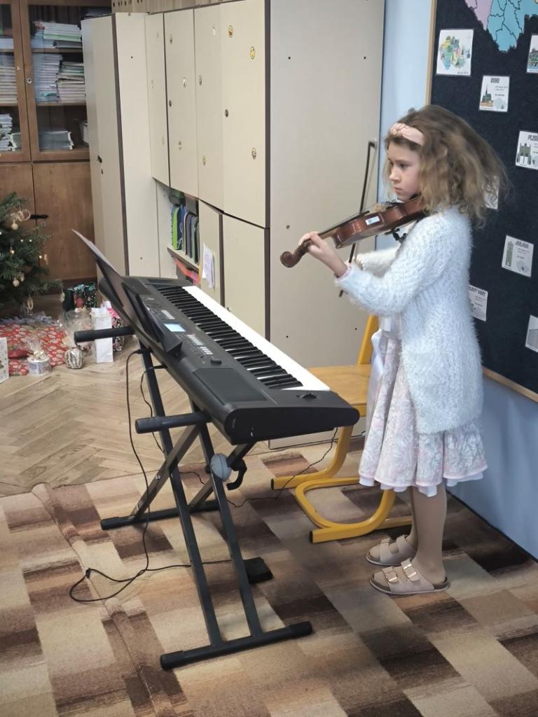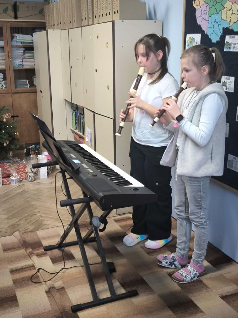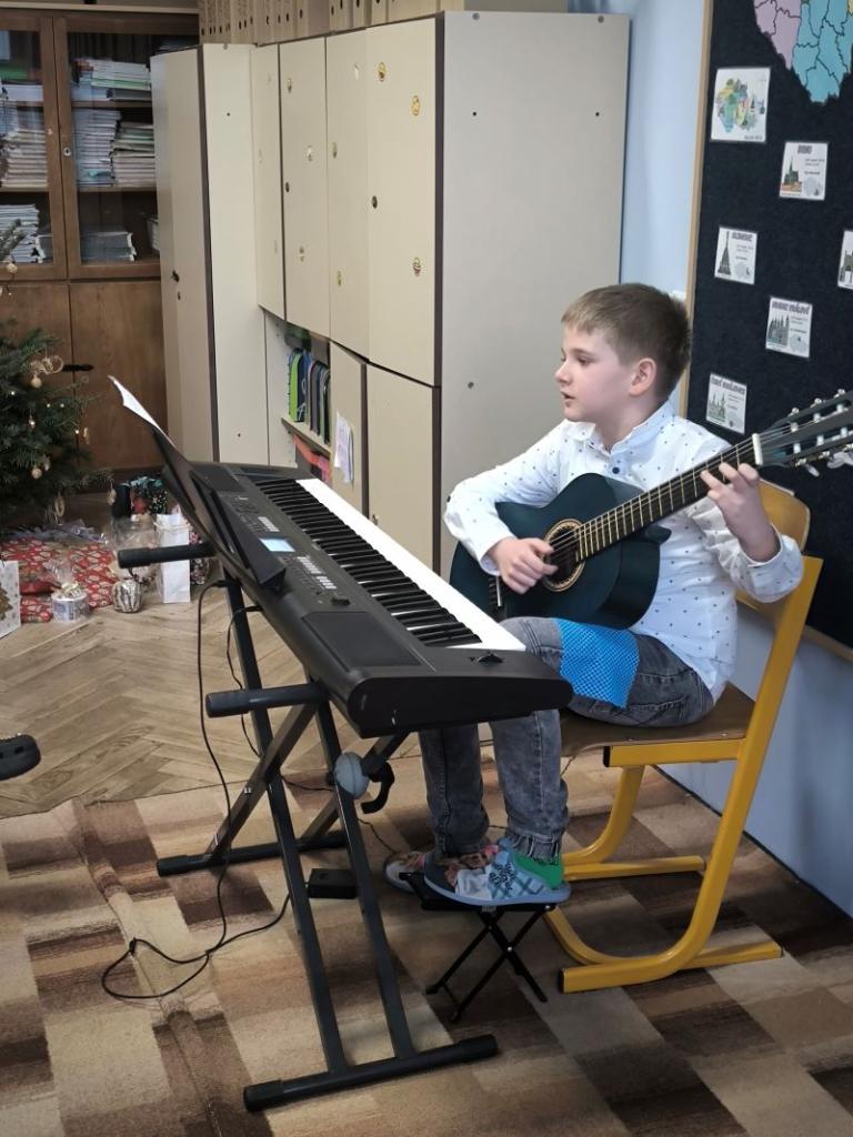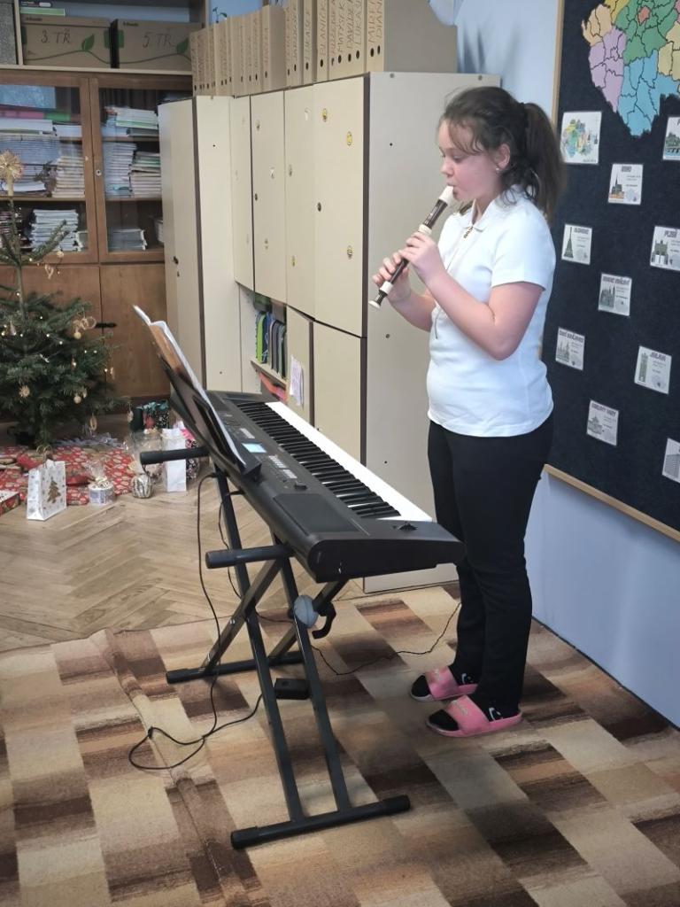 Všichni žáci chodili každý den v určených barvách. Naší třídě se povedlo, že na čtvrtek jsme si vylosovali bílou. Děvčata byla ráda, že si můžou vzít dva různé bílé vánoční outfity. Závěr týdne jsme zakončili jako vždy tradiční besídkou. Je skvělé, že nám na nástroj hraje čím dál víc spolužáků. Celá čtvrtá třída přeje všem pohodové Vánoce a do nového roku 2026 jen to nejlepší.